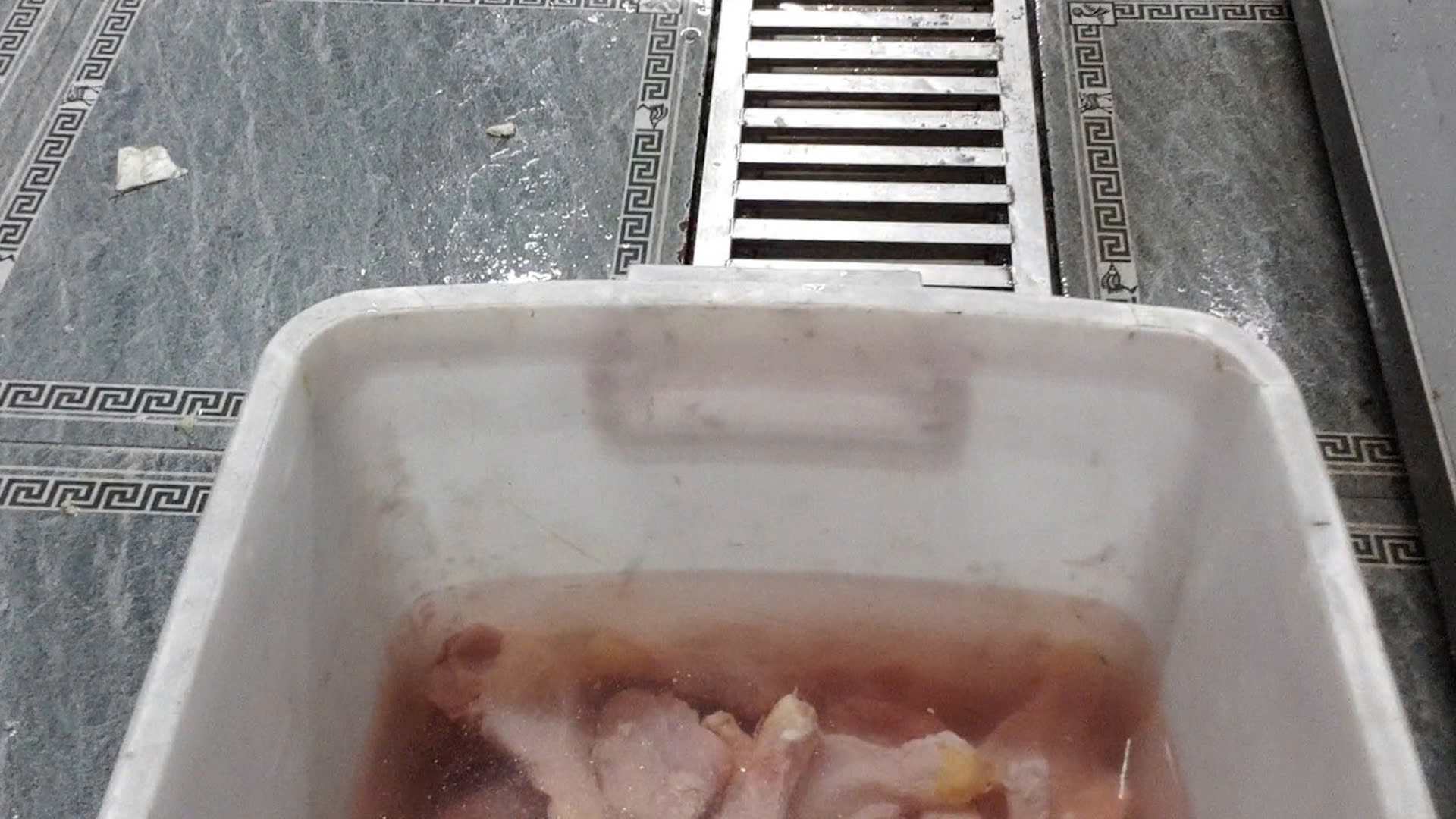 Bên trong khu chế biến, nhiều đùi gà công nghiệp được ngâm trong chậu nước.