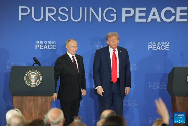 Tổng thống Nga Vladimir Putin và Tổng thống Mỹ Donald Trump họp báo sau hội nghị thượng đỉnh ở Alaska, ngày 15.8.2025. Ảnh: Xinhua