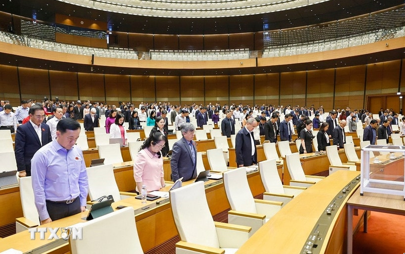 Đại biểu Quốc hội dành một phút mặc niệm tưởng nhớ các nạn nhân bị thiệt mạng do thiên tai, bão lũ gây ra. (Ảnh: Doãn Tấn/TTXVN)