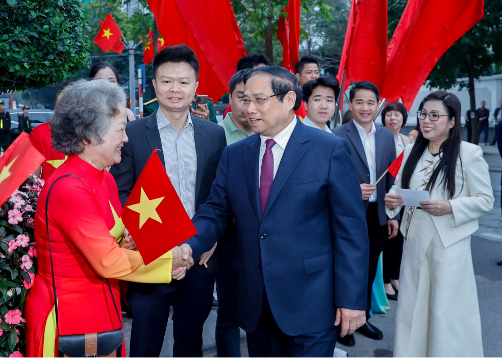 Thủ tướng Chính phủ Phạm Minh Chính và Phu nhân trò chuyện với cử tri khu vực bỏ phiếu số 21.