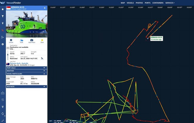 Cung đường tìm kiếm MH370 của tàu Armada 86 05 tính đến ngày 23.1.2026. Ảnh: Kevin Rupp/ Vessel Finder