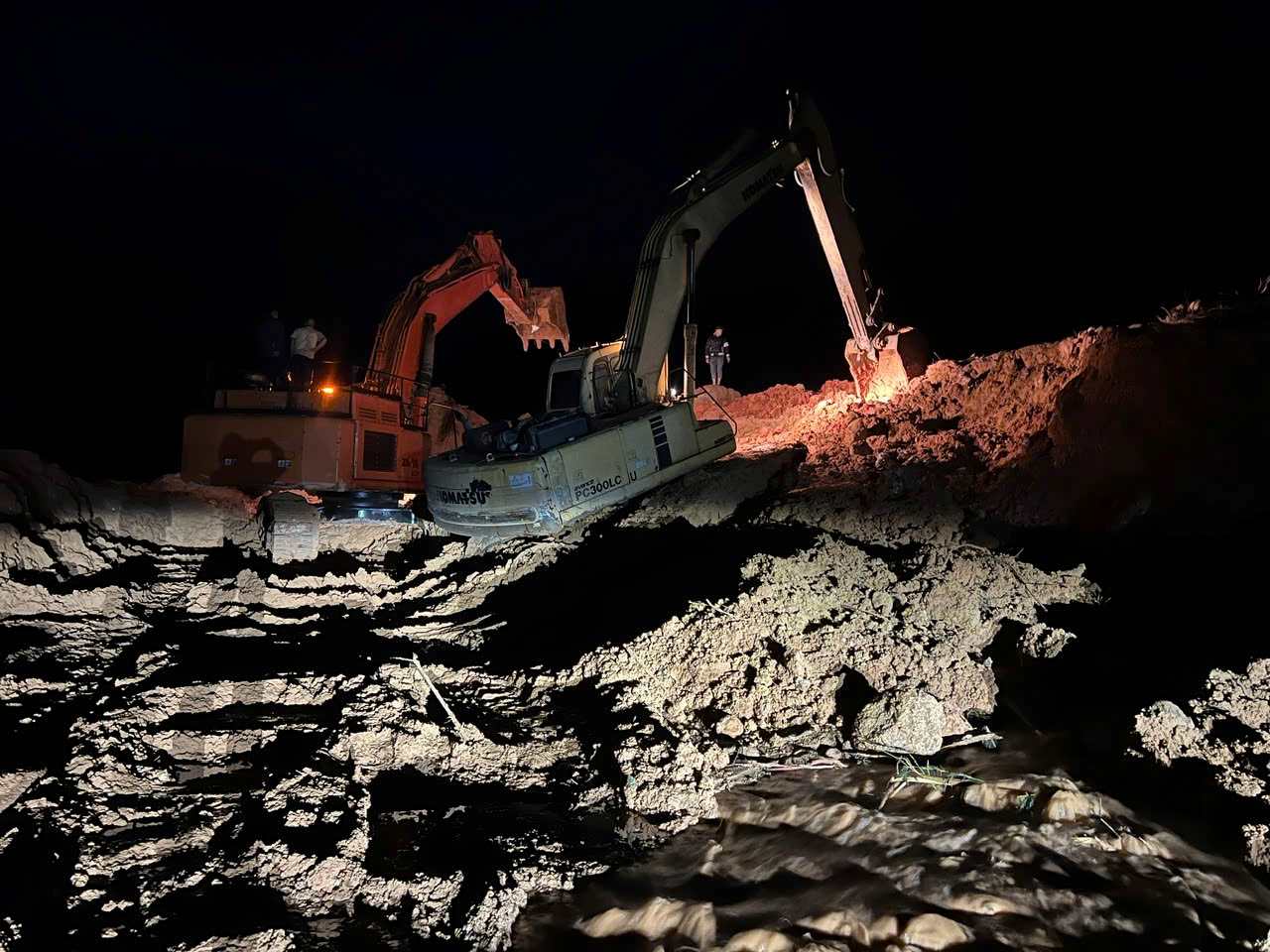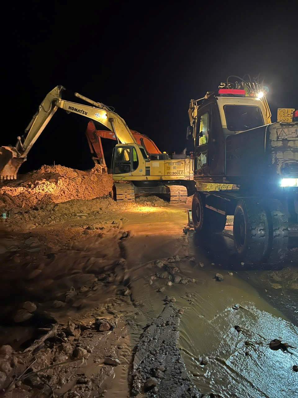 Lực lượng chức năng đang chạy đua để khẩn trương giải phóng khối lượng đất đá sạt lở trên đèo Khánh Lê. Ảnh: Hữu Long