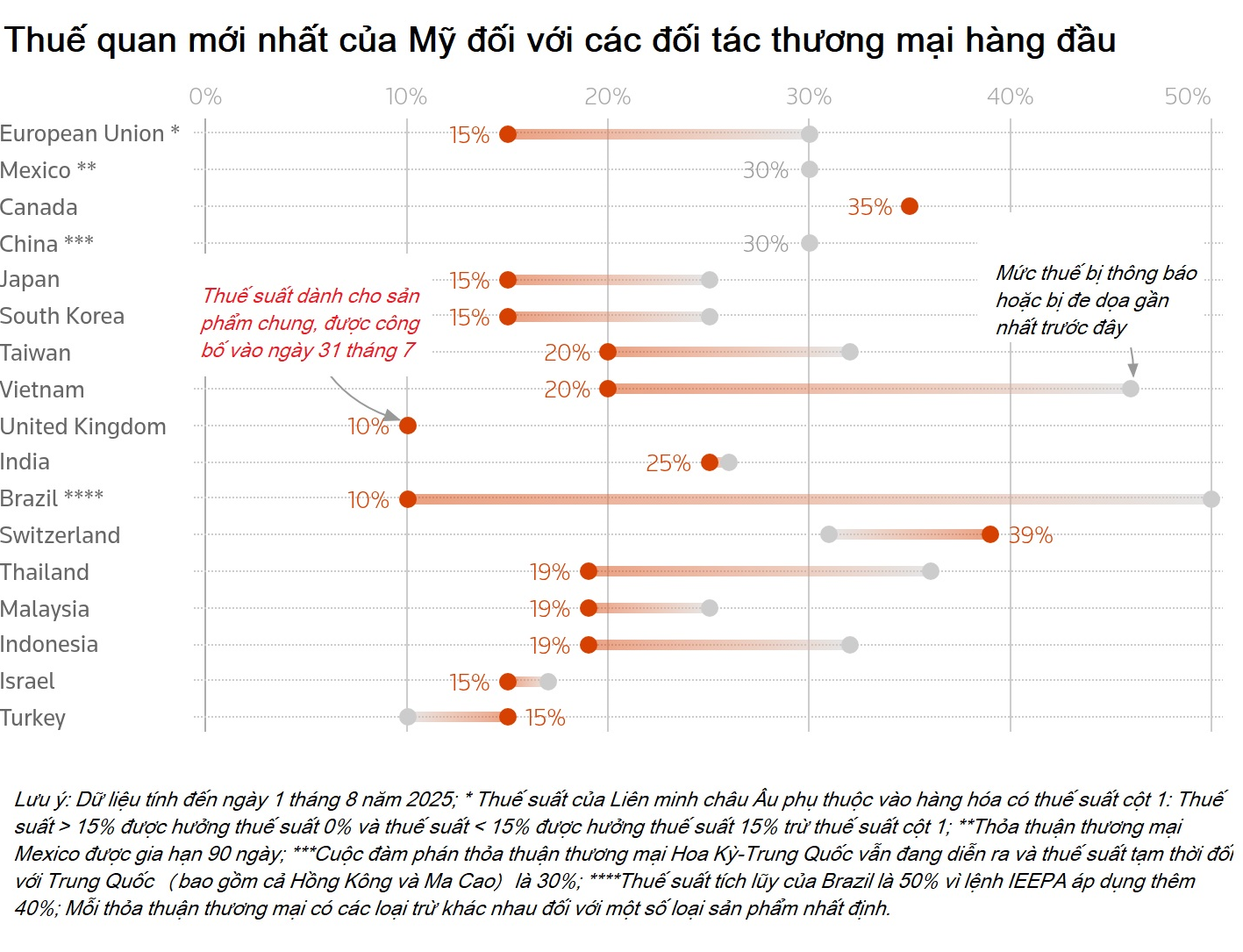 Đêm 31/7 theo giờ địa phương, chính quyền Mỹ của Tổng thống Donald Trump đã công bố danh sách đầy đủ các mức thuế quan "đối ứng" mới đối với hàng chục đối tác thương mại.