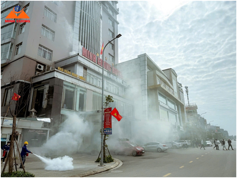 Ngay sau phần tuyên truyền, Đội Chữa cháy và cứu nạn, cứu hộ khu vực số 20 phối hợp khách sạn Minh Cường tổ chức thực tập phương án chữa cháy và cứu nạn cứu hộ theo tình huống giả định xảy ra cháy tại khu vực tầng 1 do sự cố chập điện, ngọn lửa lan nhanh, phát sinh nhiều khói, khí độc; Trong khách sạn khi đó còn nhiều cán bộ, nhân viên, khách hàng đang làm việc và nghỉ tại các tầng.